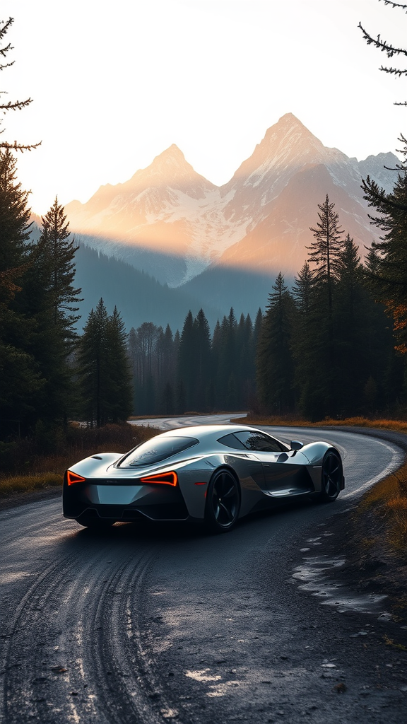 A hyper-realistic image of a cutting-edge electric hypercar gliding effortlessly along a winding forest road. Towering mountains dominate the background, their peaks shrouded in a subtly ethereal mist. The scene is bathed in soft, golden hour light, highlighting the metallic sheen of the car's futuristic bodywork. Intricate details such as the reflection of sun-dappled leaves on the car's windows and the delicate tire tracks in the damp earth are vividly captured in 8K HDR quality, ensuring every pixel is infused with richness and depth. The ambiance conveys a perfect blend of nature's tranquility and the thrilling pulse of high-speed innovation.