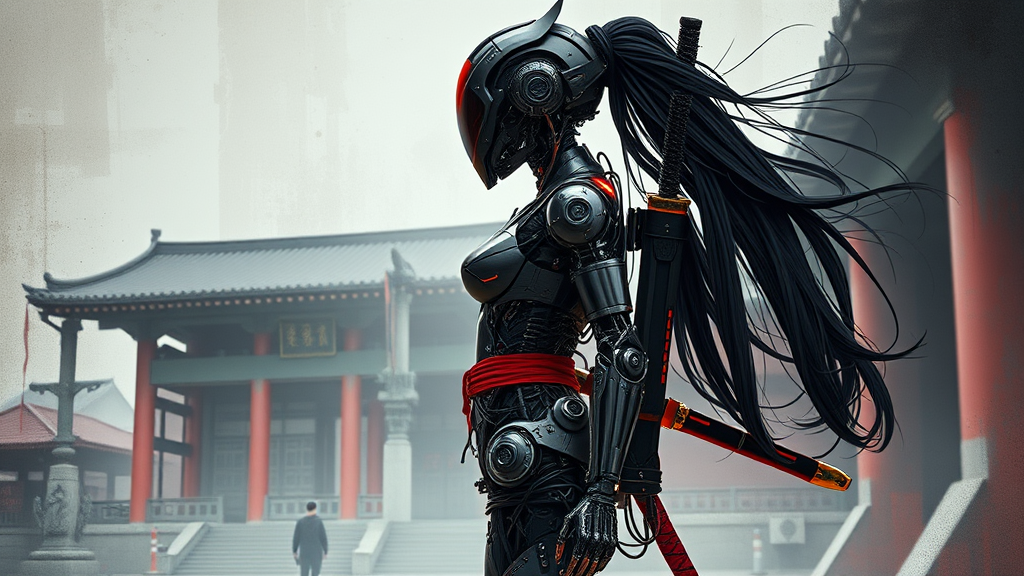 A full body view of a female cyberpunk robot samurai in the style of ck-sfc, featuring a mirrored face shield that conceals her robotic face. She wears a hyperdetailed helmet with flowing black hair cascading down her back. Her reflective black armor is accentuated with neon red highlights, covering a body constructed of intricate robot joints, metals, cables, and wires. She stands barefoot with a sleek katana strapped securely to her back. The abstract background hints at an eastern temple, with subtle architectural designs infused with a futuristic twist.