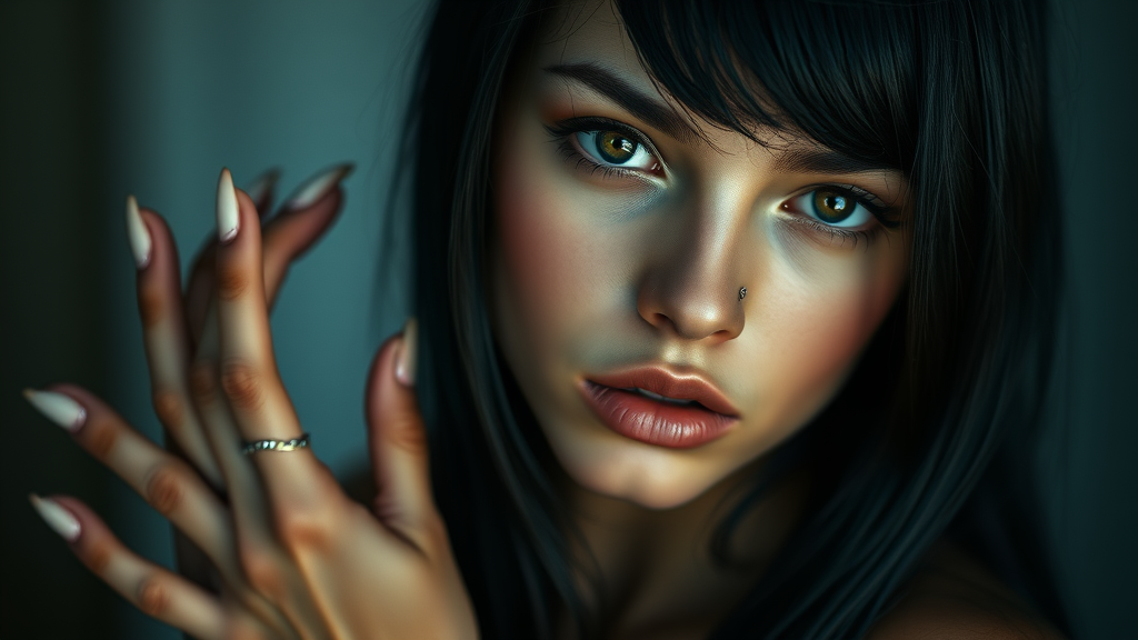 Striking young woman with dark hair gazing directly at the viewer, captured in a portrait-style photograph. Her skin is meticulously detailed, emphasizing a highly realistic appearance in an 8k, high-detail, full-length frame. She sports a piercing and is illuminated by soft, diffused lighting, enhancing the scene with a shallow depth of field and sharp focus. The image embodies hyperrealism with cinematic lighting akin to CGI, presenting a doll-like aesthetic rendered with octane rendering techniques. Despite the realism, the image is marred by elements like text overlay, low resolution, and artifacts reminiscent of JPEG format. The composition includes visual disturbances like cropping and misalignment. The subject displays anatomical discrepancies with oddly proportioned limbs, distorted features, redundant appendages, and blurred areas, resulting in a surreal portrayal that blends beauty with unsettling characteristics.