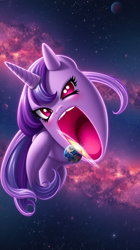 Enormous Twilight Sparkle from My Little Pony, larger than a galaxy, floats majestically in the cosmic expanse, her radiant form dwarfing celestial bodies. A tiny galaxy hovers delicately in front of her vast, open mouth. Her eyes, glowing an intense, fiery red, reflect the grandeur of the universe as she prepares to consume the galaxy. The scene is captured in an extreme zoomed-in, photo-realistic perspective, highlighting the intricate details of her shimmering mane and the swirling stars caught in her gravitational pull, adding a sense of ethereal wonder to this cosmic tableau.
