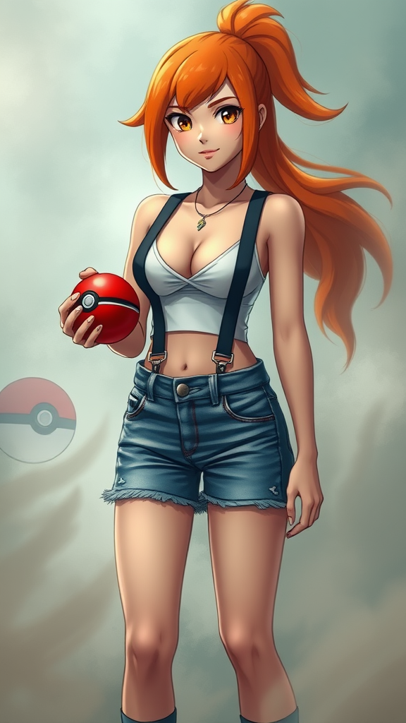 A confident girl with bright orange hair stands amidst a swirling fog, holding a Pokeball. Her tank top reveals a hint of cleavage, complementing the suspenders that rest over it. Her low-waisted jean shorts reveal a bold, playful style, contrasting with the thong hinting at a daring fashion choice. As she stands poised, her presence radiates strength and charm, reminiscent of a beloved character from Pokémon.