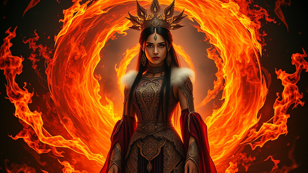 A hyper-maximalist cinematic tribal dark fantasy featuring a young, beautiful Queen of Fire, standing prominently amidst a swirling spiral of flames. Her full body is adorned in intricately detailed clothing, with a perfect and strikingly beautiful face. She strikes an elegant pose, exuding an aura of power and grace. The composition is flawless, blending realism with a fantastical edge, as elements reminiscent of a circuit board weave into the design, enhancing the mystical ambiance. This art piece is a fusion of fantasy illustration and photorealistic concept art, enhanced by intense shadows and dramatic lighting. Rendered in ultra-detailed 8k resolution with high-definition quality, its sharp focus and HDR provide a stunning visual experience, making it ideal as a captivating wallpaper.
