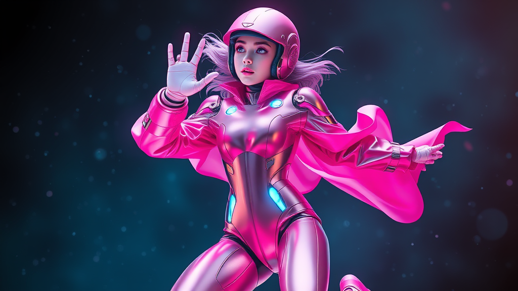 A high-resolution image that captures the essence of a dynamic character in a futuristic setting. She is a shining AI, with a face that closely resembles a human's. She wears a sleek metal suit and a glossy helmet, poised energetically in a leaping pose. Flowing garments suggest motion, and the vivid color scheme of pink and reflective silvers infuse a nightcore aesthetic. Dramatic backlighting produces a neon glow, contrasting with the cosmic dark hues of the backdrop. The character is bright, her purple eyes shimmering as she gazes and reaches for something above. The image has sharp focus on her, with a blurred background mimicking depth of field clarity. Her clothing and hair have realistic textures, and a visible light source in her hands casts a gleaming, otherworldly effect. The composition is like a candid snapshot, capturing a spontaneous moment of action in a surreal, sci-fi universe. Photographed with a GoPro HERO10 Black, Cinematic vibes akin to Cinestill 800T and cyberpunk styles, the image presents a cinematic scene captured in a surreal frame.