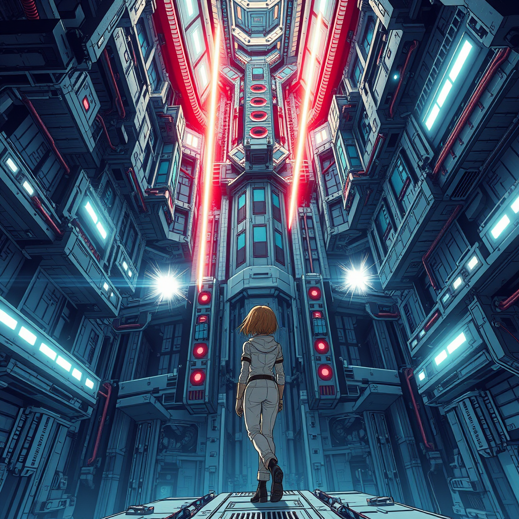 Girl in a sleek spacesuit navigating the interior of a massive spaceship, depicted in a style reminiscent of Tsutomu Nihei’s work. This scene embodies the essence of Sidonia no Kishi with its towering structures and expansive space. A colossal laser generator hums at the center of this multi-story vessel, its beams shooting up towards the sky, surrounded by pulsing energy clots. The environment is charged with acceleration and flashes of light, creating a sense of incredible speed and futuristic adventure. Captured in a hyper-detailed, high-definition style, the artwork balances the realms of anime and manga, depicting an intricate first-person perspective of this sci-fi marvel, rendered in stunning 8K resolution, blending manga graphics with super-resolution clarity.