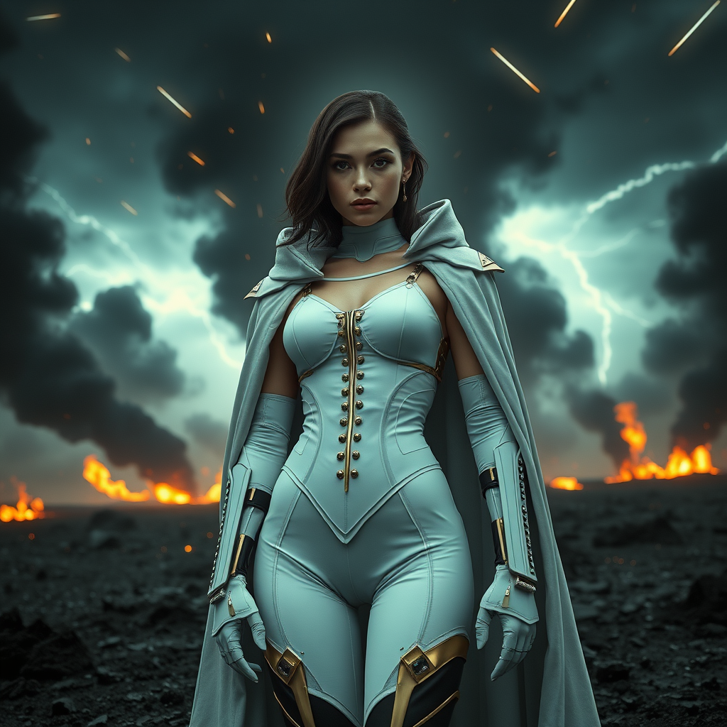 A stunningly beautiful young woman with a slender athletic build stands encapsulated in a futuristic sci-fi landscape, reminiscent of "Ghost In The Shell." Her striking aristocratic features are accentuated by a mix of arrogance and innocence in her expression. Sheβs adorned in a form-fitting white jumpsuit paired with armored leggings, enveloped in a dense cloak amidst a meteor shower and black smoke from distant fires. The dramatic background is filled with thunderclouds that enhance the gloomy atmosphere. The scene is framed from a low angle through a Canon EOS 5D Mark IV DSLR, set at f/8 aperture, with a shutter speed of 1/250 second and ISO 100, capturing super detailed hyperphotorealism. Natural reflections and cinematic lighting reveal intricate textures, hints of a gold corset with rivets, and highlight her bare arms, neck, and midriff. Flames' reflections create a stained yet vibrant lighting across the scene, casting bright and sometimes blinding illuminations. Despite the chaotic environment, an atmosphere of symmetry and calmness permeates the portrait, skillfully avoiding distortions, proportion errors, or any extraneous elements, preserving the captivating essence and elegance of the subject in her high-tech armor.