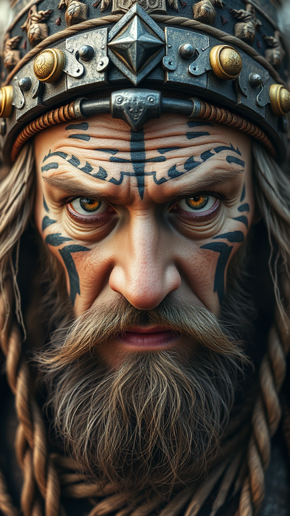 A seasoned Viking warrior, with a deeply wrinkled face and piercing bright brown eyes that shine with wisdom and intensity, perfect in their symmetry. His weathered skin tells tales of countless battles, adorned with intricate war paint that accentuates his fierce expression. He wears a majestic war bonnet adorned with feathers and symbols of his victories, returning home from war with a sense of solemn triumph. Rendered in ultra-realistic detail, capturing every scar and line in 8k resolution, as if brought to life with an octane render's vivid clarity.