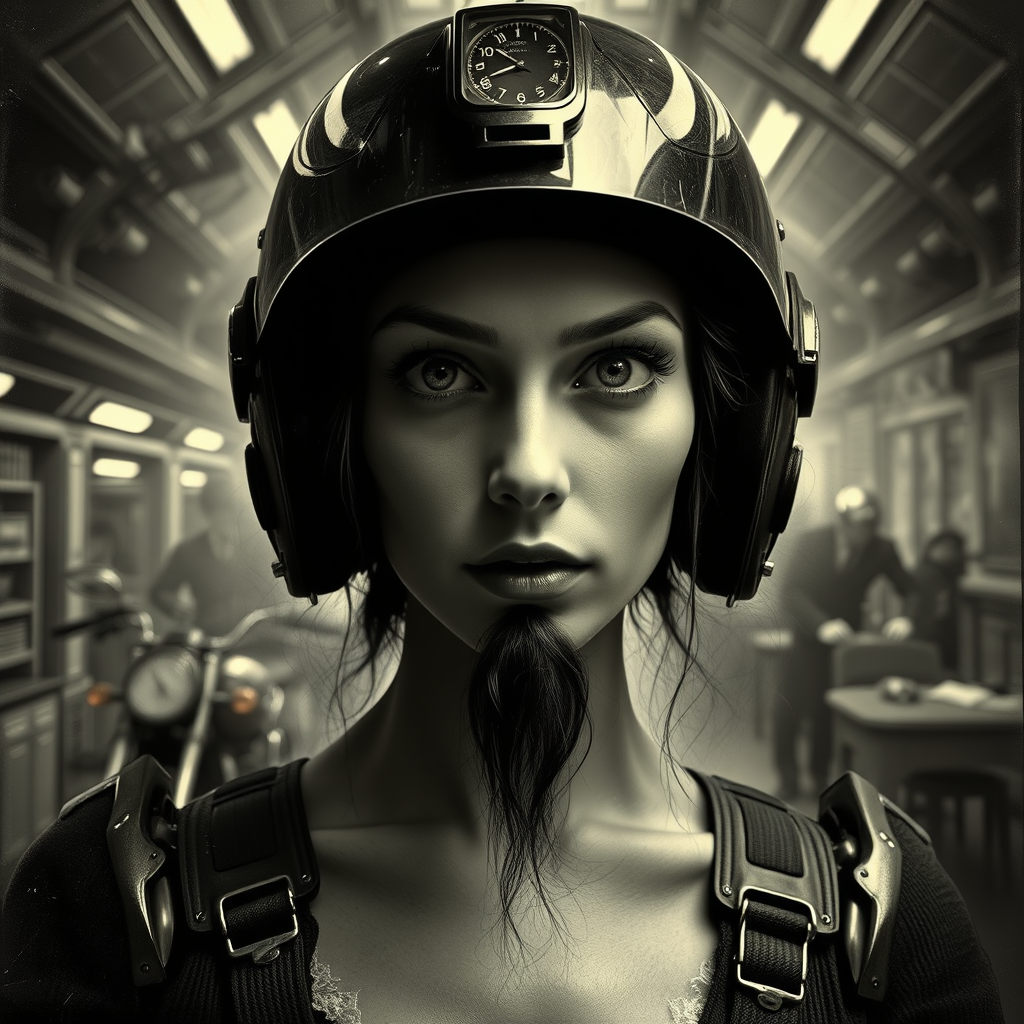 A dramatic three-quarter close-up portrait of a single woman set in a dystopian scenario of a zombie outbreak within a city of clones. She is equipped with The Armor of Blood, designed by TMax Bedulenko, and her backdrop transitions between a space station, a Provence interior, and a 1920s romantic-style classroom. The scene creatively incorporates the essence of two faces and two concepts merged, forming a draft-like narrative. Adding a touch of science fiction, picture an Ironman-inspired motorbike and a motorbiker with an oversized helmet and pointed footwear. The imagery is intentionally surreal, with elements that defy traditional anatomy, such as fused fingers or blurred outlines, creating an abstract and dreamlike quality. Characteristics like a long beard, multiple navels, and unusual proportions add to the whimsical nature of the concept. The woman’s expression is captured in an old photo style, blending black and white tones to emphasize contrasts in the scene. Despite the chaotic setting, the atmosphere embodies a romanticism reminiscent of the early 20th century, while simultaneously hinting at futuristic themes, producing a unique, multi-layered visual narrative.