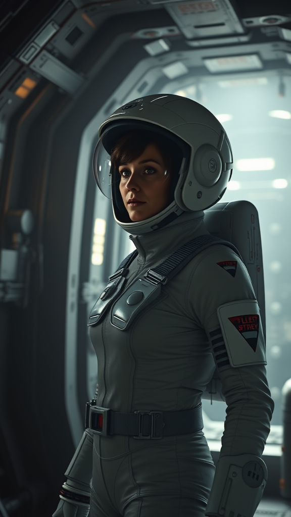 Epic cinematic 8k wallpaper of Ellen Ripley from the Alien movie, dressed in a high-tech astronaut suit with a sleek helmet on and visor closed, standing confidently inside the Nostromo space shuttle's dimly lit, industrial interiors. The scene is photorealistic with cinematic movie quality, enhanced by VFX post-production and RTX ray-traced lighting creating dramatic shadows and highlights. The setting feels ultra-realistic and hyper-detailed, capturing every rivet and panel in HD, HDR, and rendered in stunning 4k and 8k resolution. Shot with a classic Mitchell BNC camera, utilizing Octane Render for exceptional depth and texture, the image also features a subtle haze effect to emphasize the ominous atmosphere.