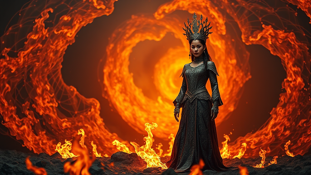 A stunningly complex hyper-maximalist overdetailed cinematic tribal dark fantasy scene featuring a young, strikingly beautiful Queen of the Fire standing majestically on the ground amidst a swirling vortex of flames. Her full body is adorned in intricate, otherworldly attire, her face flawless and mesmerizing. She strikes an elegant pose with perfect composition amidst a backdrop that evokes awe. Realistic yet fantastical, her presence is an extraordinary blend of fantasy and technology, with subtle elements of a circuit board woven into her ensemble. This art piece is an ultra-high-definition, photorealistic concept art rendered in 8k resolution, capturing intense shadows and dramatic lighting. It is a masterpiece of sharp focus suitable as a dazzling wallpaper, merging the essence of trial dark fantasy and modern visual aesthetics.