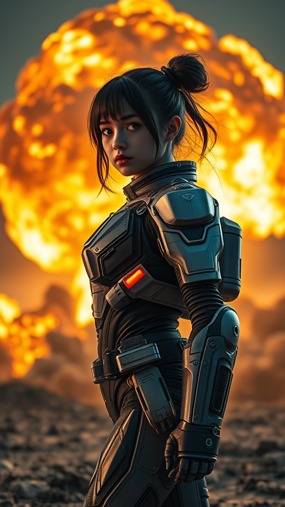 A full-body, futuristic portrait of a girl in an exo suit with sci-fi armor, set against the dramatic backdrop of a nuclear explosion. The fiery blast wave casts an intense glow, illuminated with nuclear ash swirling amidst the chaos. The scene captures the essence of atomic fission with maximum detail in 8K UHD, blending cinematic and photographic elements to achieve a hyper-realistic, super-detailed depiction. In this third-person view, the complex lighting enhances the cinematic staging, creating an acceleration effect with a flash of light and a sense of speed, reminiscent of a movie still. The long exposure highlights the intricate details of the armor and the environment, styled in a futuristic science fiction manner with a touch of dynamic artistry, capturing a moment of high tension and remarkable clarity.