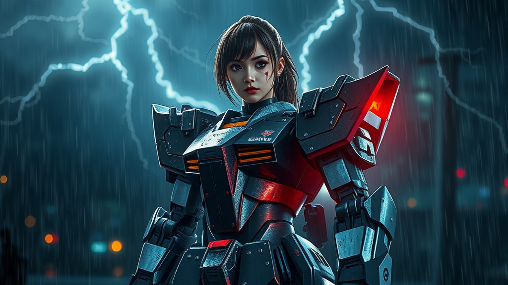 A young woman clad in battle-scarred Gundam armor stands amidst a dark, stormy night. Her armor is a testament to an epic confrontation, reflecting the harsh glow of lightning against the smooth, shiny surfaces, yet bearing the marks of conflict. The scene is cinematic, with dramatic lighting that highlights her detailed, determined face as raindrops dance around her. The stunning environment merges with surreal and divine elements, creating a celestial atmosphere reminiscent of anime and manga. Vivid colors play across the scene, casting hyperrealistic reflections on the wet ground. Despite her injuries, she exudes strength, poised for whatever comes next. Amidst the imperfect surroundings, where reality blurs with imagination, the focus remains on her resilience and the beauty of the moment.
