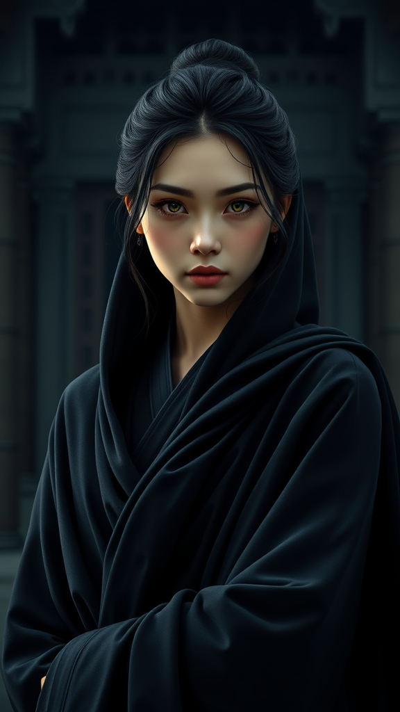A young woman draped in elegant dark robes stands against a temple backdrop, her symmetrical eyes reflecting the dramatic, moody lighting. This scene is captured in hyperrealistic detail with sharp focus and high-definition clarity, showcasing a complex and intricate composition akin to a high-end photographic masterpiece. The dynamic pose enhances the visual storytelling, while advanced raytracing and physics-based rendering techniques bring the image to life. Blending the realism of CGI and 3D artistry with the stylistic elements of cartoon, anime, and digital painting, this digital artwork blurs the lines between illustration and hyperrealism, creating a captivating and immersive visual experience.