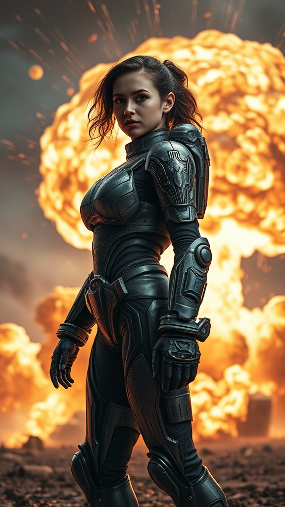A full-body portrait of a young woman in a highly detailed exo suit, clad in intricate sci-fi armor, standing resolute against a backdrop of a cataclysmic nuclear explosion. The blast wave and swirling nuclear ash create a chaotic yet mesmerizing scene, capturing the raw power of atomic fission. The composition is reminiscent of a dramatic movie still in stunning 8K UHD, showcasing futuristic and cinematic elements with hyper-realistic detail. The scene is portrayed in a long-exposure style with an intense flash of light, emphasizing speed and acceleration. Complex lighting enhances the photorealistic quality, casting dramatic shadows and highlights that suggest a moment