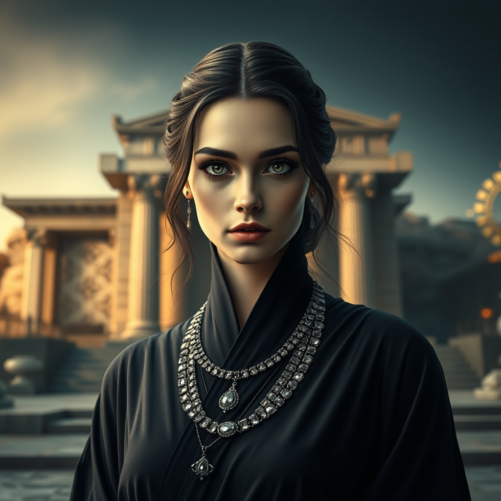 A mysterious woman in dark robes stands solemnly before an ancient temple. Her symmetrical eyes glimmer under dramatic lighting, capturing an air of enchantment. The realistic scene is brought to life with sharp focus and meticulous detail, creating an intricate hyperrealism akin to a high-definition photograph. The scene employs raytracing and physics-based rendering techniques, resulting in an ultra high-resolution image suitable for 8K wallpapers. She dons exquisite jewelry, accentuating the ornate intricacy of the setting. The artistry blends CGI and 3D elements with hints of illustration and digital painting, all impeccably rendered to avoid any blemishes such as blurriness, poor proportions, or unpleasant distortions. This captivating scene evokes a sense of elegance and mystery, immersing the viewer in its beautifully crafted, realistic world.