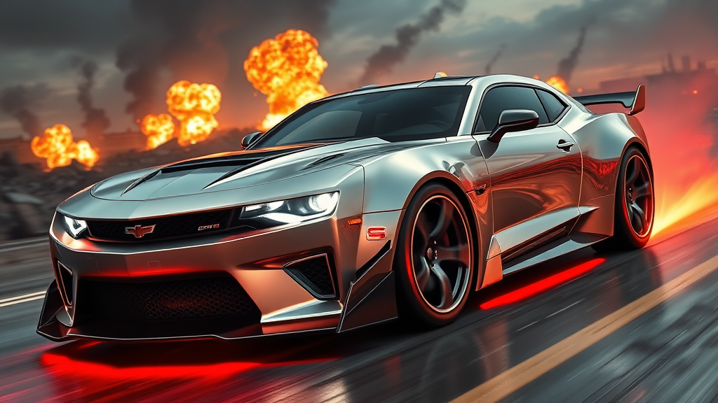 Hyper-realistic futuristic muscle car with sleek, aerodynamic design, gleaming bright aluminum body adorned with matte black accents, intensely bright LED headlights, high resolution photo capturing the raw power and dynamism, vivid glowing neon underlights, backdrop of a dystopian cityscape in ruins with fiery explosions illuminating the night sky, conveying a sense of thrilling speed, extraordinarily detailed with ultra-realistic ray traced reflections and shimmering specular highlights, shot from an angle that showcases the car's aggressive stance and power.