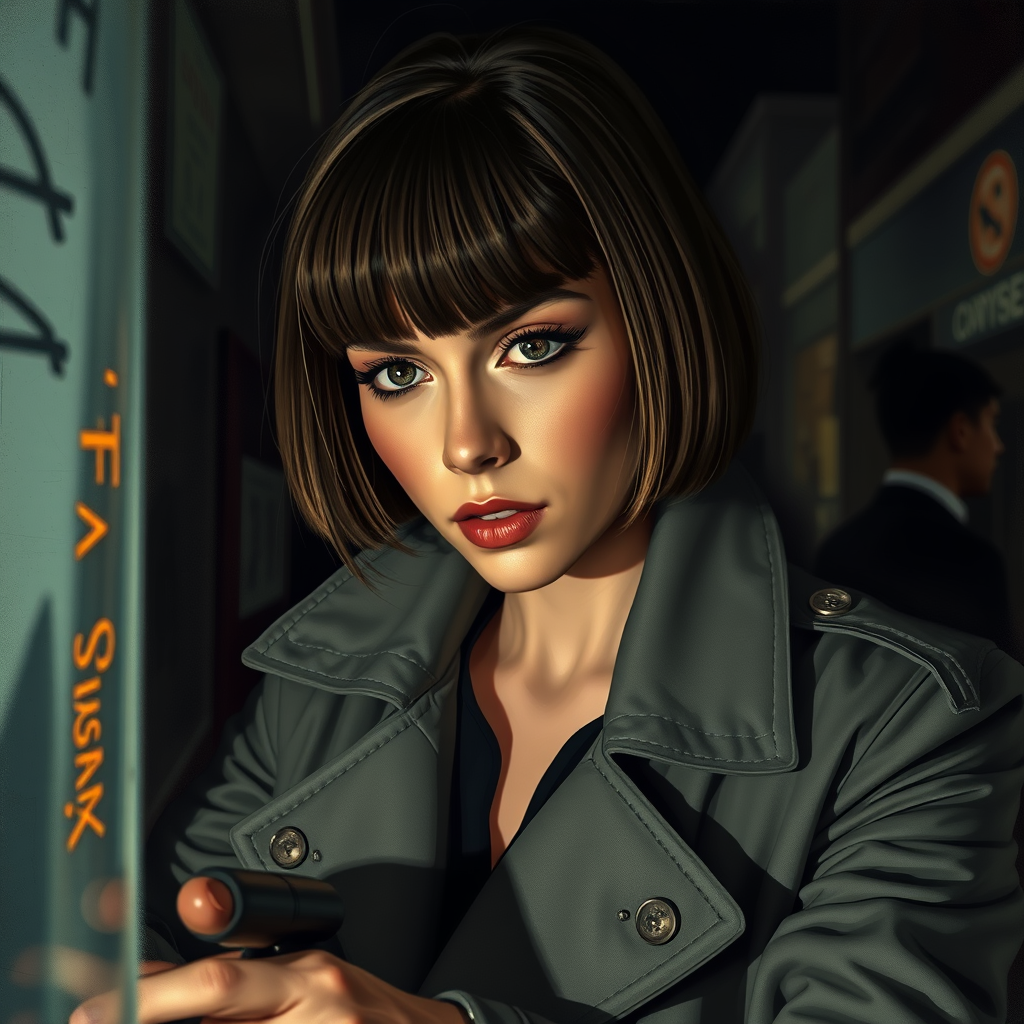 A self-assured female detective with a sleek bob hairstyle and perceptive brown eyes, dressed in a tailored gray trench coat, meticulously examining evidence in a shadowy crime scene. Her expression, painted with the distinctive flair of Wes Anderson, captures a blend of curiosity and determination. The backdrop is gritty and atmospheric, hinting at the complexities of the urban landscape. Her focused stance conveys an underlying narrative, blending intrigue and sophistication within the artistic portrayal.