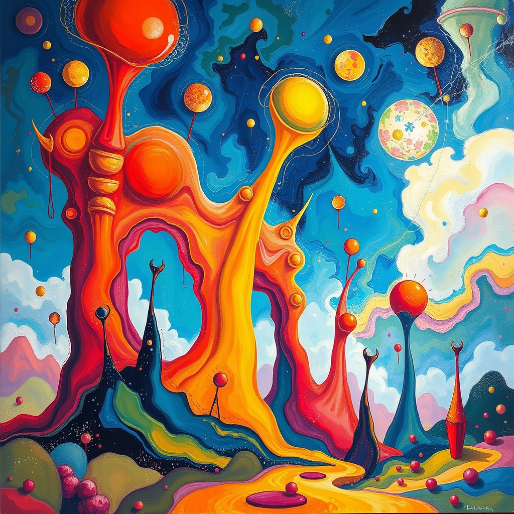 Whimsical marvels, dreamlike landscapes, vibrant colors merging into abstract forms, elongated structures reaching upward, fluid shapes floating in an ethereal dance, embracing a childlike awe within a surreal canvas, bold strokes capturing the essence of boundless imagination.