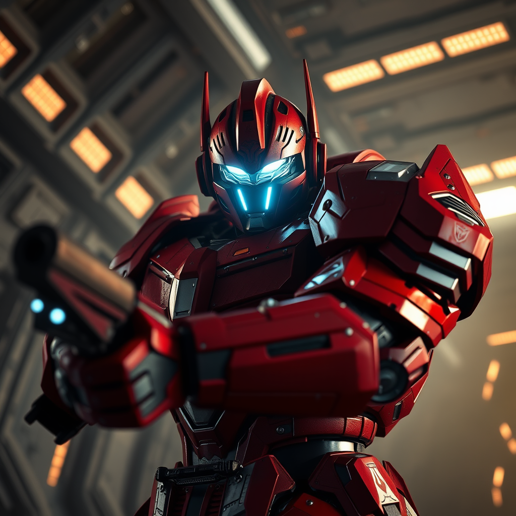 Ultra-wide shot of a strong warrior in red sci-fi armor featuring an intricately designed cyber helmet with illuminated details on the cyber mask. The full insulated armor has an angry, dynamic pose reminiscent of Optimus Prime, showcasing a powerful stance while wielding a futuristic weapon. The warrior has a bald head, and the armor is adorned with fine details, embodying a dark sci-fi movie style. The backdrop is a dramatically lit spaceship, captured through a photographic lens with natural, moody lighting. The scene benefits from photorealistic cinematic rendering and advanced ray tracing, presented in third-person view with a subtle blur effect and long exposure for added depth. The image is rendered in 8K Ultra-HD, enhancing the highest level of detail with cinematic lighting for a compelling visual experience.