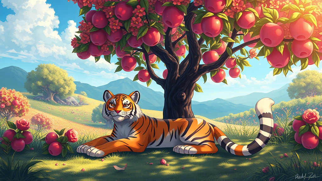 Create a digital art piece featuring a stunning tiger-like Pokémon lounging gracefully beneath a vibrant apple tree. The scene should be in a charming cartoon style, blending elements of Matte Painting with Magic Realism. Use bright and vivid colors to bring the landscape to life, ensuring hyper-quality and high-detail for an immersive visual experience. The composition should be in high resolution, capturing every intricate detail of the fantastical setting. The atmosphere should evoke a sense of wonder and whimsy, as the enchanting creature and its serene environment are bathed in a magical light.