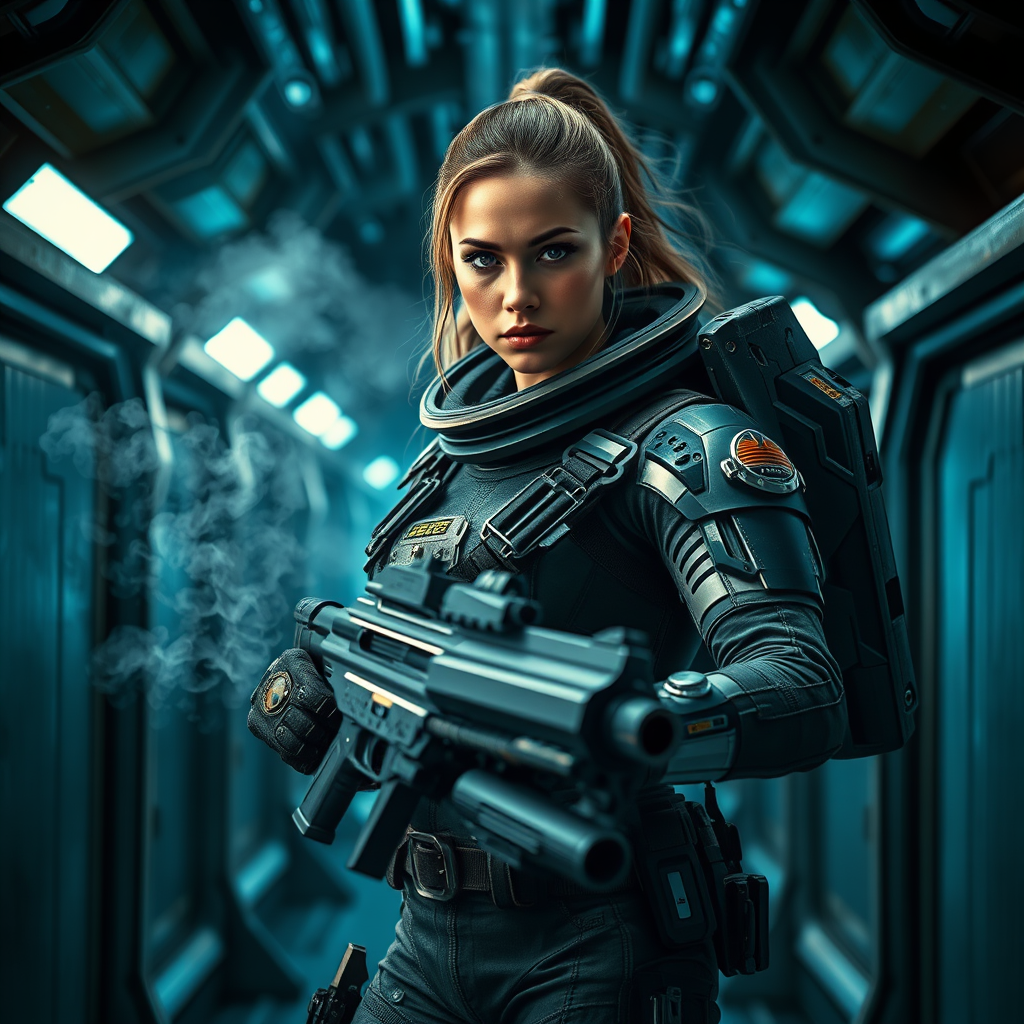 Epic cinematic 8k wallpaper of a powerful woman in a futuristic space environment, wearing a rugged space suit, standing in an action-ready pose. The scene is set in a dimly lit spaceship corridor, with steam and eerie blue lighting adding a dramatic atmosphere. Her determined expression and fierce gaze convey strength and resilience, while shadows play across the metal walls, creating a sense of tension and anticipation. She grips an advanced weapon, prepared to face any lurking threat, embodying the essence of a courageous sci-fi hero.