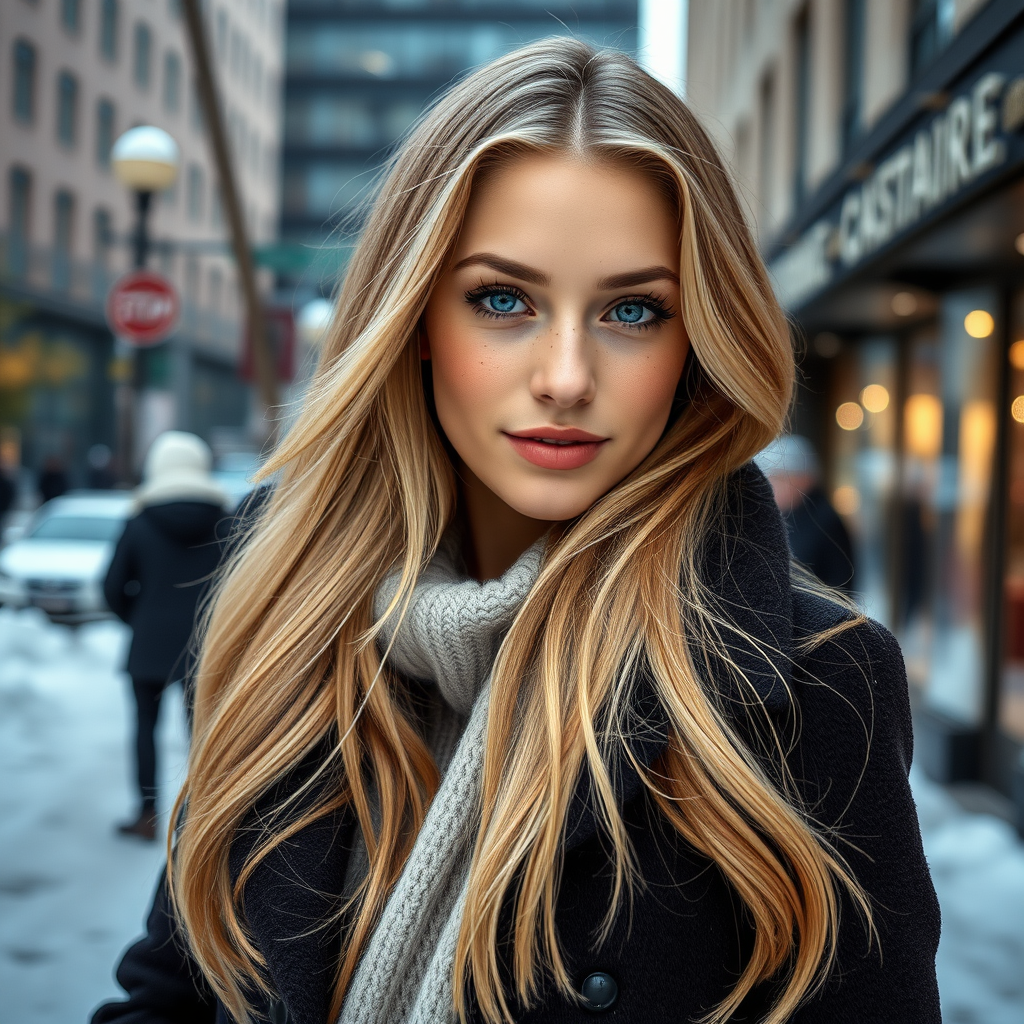 A captivating portrait photograph of a stunning Norwegian girl in chic winter attire, showcasing long, flowing blonde hair and a playful expression. Her face is beautifully symmetrical, adorned with charming freckles and subtle, flawless makeup. She stands gracefully in a snowy urban street scene with a backdrop of modern architecture, exuding elegance and sophistication. The image is ultra-realistic and conceptually artistic, featuring intricate detailing and sharp focus with a depth of field at f/1.8 using an 85mm lens. The composition is a balanced mid-shot, emphasizing her poise against the stunning upscale environment, with professionally enhanced color grading and bright, softly diffused lighting. The scene is enveloped in a gentle volumetric fog, making it visually striking and perfect for trending on platforms like Instagram and Tumblr. This HDR image is captured in high resolution, ensuring every detail is remarkably sharp.