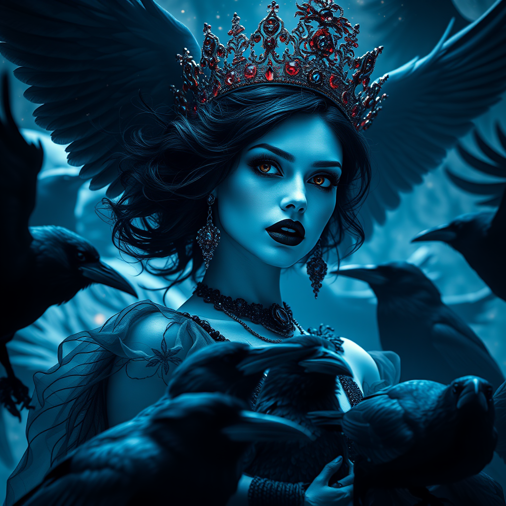 A mesmerizing queen of ravens, surrounded by her loyal flock, exudes an air of dramatic mystery and allure. Her black plumes flutter as she commands the ravens with an authoritative grace, her black lipstick contrasting starkly with her icy blue skin. With cascading black hair framing her face, her eyes, a deep Pantone 2766, pierce through the scene. Transported to a world reminiscent of World of Warcraft, there is a surreal, psychedelic essence to her presence, as if born from the very fabric of the galaxy. Clad in a diaphanous silk gossamer dress, she moves effortlessly through this astral realm, bathed in stars and surrounded by the cosmos. A full-body portrait captures her in a low-angle shot, the regal contours of her form accentuated by a radiant halo of iridescent red. Her ethereal crown, exquisitely ornated, gleams under god rays and radiant light, casting an aura of majestic power. The setting is an ultra-realistic, detailed environment that blends dark fantasy with a macabre beauty, inspiring awe and fear alike. An atmospheric blend of hyperrealism and finely-crafted details unfolds in an epic wide shot, where sharp focus reveals every nuance of this cinematic scene. Rendered with precision akin to octane render and inspired by a Greg Rutkowski style, this illustration transcends reality, pulling viewers into a dimension of photorealistic marvels.