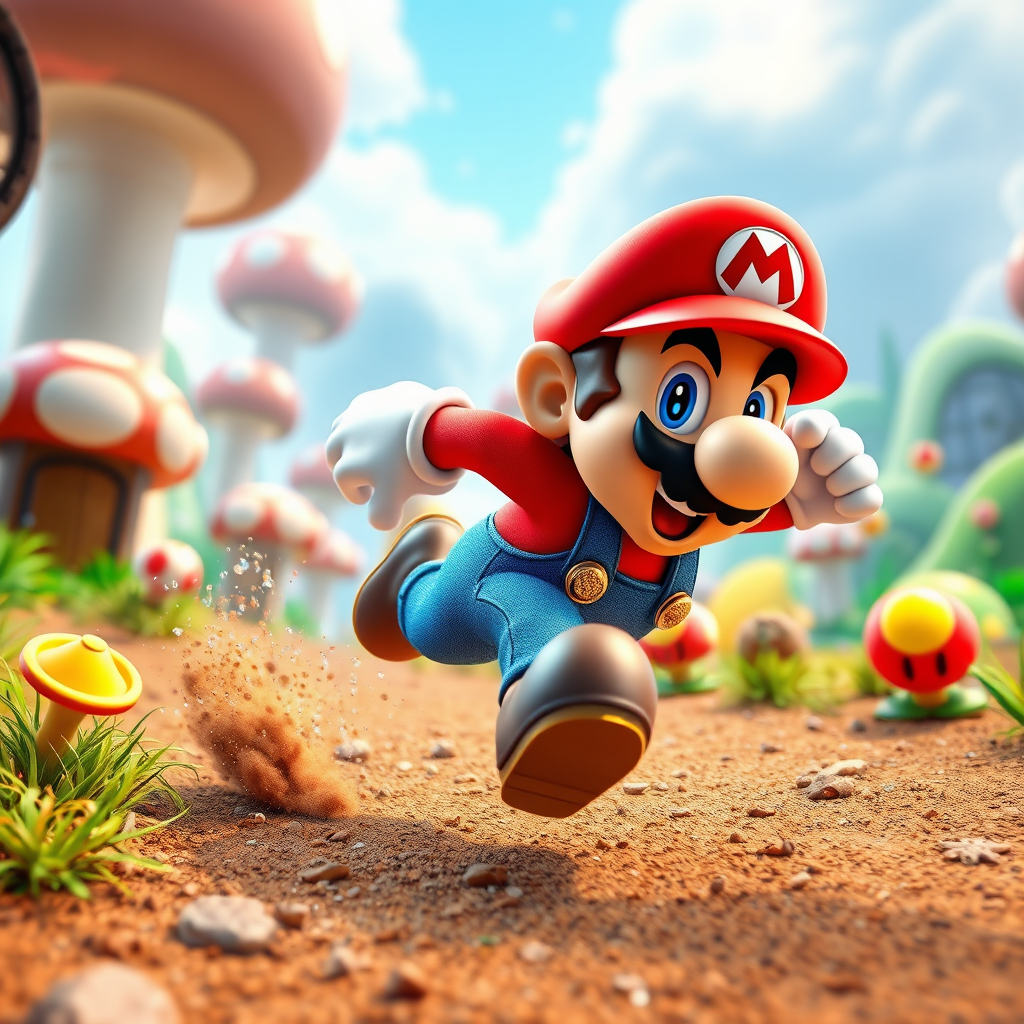 Super-Mario dashing energetically through a vibrant Mushroom Kingdom landscape, rendered in detailed 3D, showcasing dynamic elements from a popular game setting, featuring a closeup profile with vivid colors and intricate textures, leveraging modern rendering techniques, aspect ratio 2:3, set in a high-energy scene with a spirited atmosphere, enhanced with subtle creative flourishes to elevate the iconic imagery to new dimensions.
