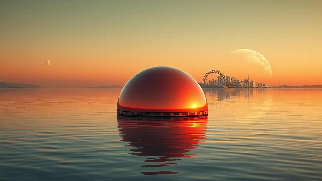 A single dome-shaped object floats serenely on the tranquil water, its surface gleaming with a subtle sci-fi aura, cast in a tonalist palette of gentle light orange and deep crimson. Bathed in natural light, the scene exudes an air of romance and desertpunk aesthetics, captured in hyper-realistic detail reminiscent of a Samyang AF 14mm f/2.8 RF lens. The distant skyline features a vibrant green city, set against the backdrop of distant planets, embodying an eroded yet futuristic interior style with shades of light red and orange. Set amidst an Australian landscape, the view is reminiscent of a Nikon D750 capture, offering transfixing marine vistas. The image is a realistic, hyper-detailed rendering in 32k UHD, merging digital art with the fantastical allure of a masterful photo.
