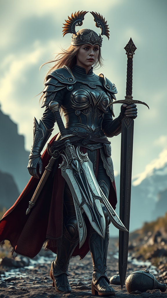full body walking pose slow motion female paladin wearing intricate armor elegant detailed intricate design holding a great sword on her right hand Masterpiece best quality 8k photorealistic by jeremy mann by sandra chevrier by maciej kuciara sharp realistic real shadow 3d render vibrant colors distinct facial features dynamic movement natural lighting harmonious proportions exquisite craftsmanship perfect anatomy grand environment breathtaking scene captivating composition stunning silhouette intense gaze poised strength confidence commanding presence radiant glow powerful stance timeless beauty heroic aura determined expression majestic setting detailed landscape precise detailing.