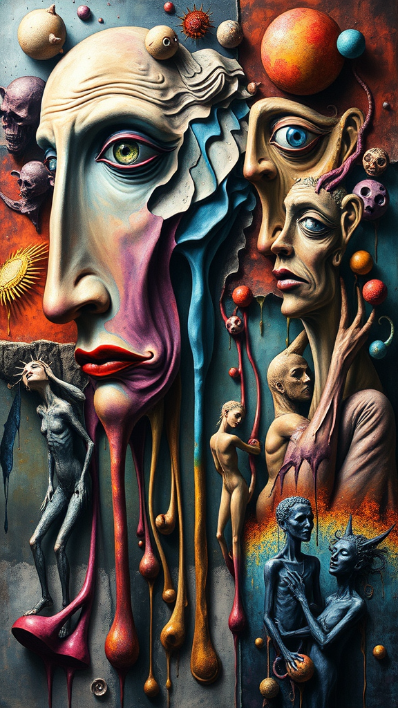 A surrealist masterpiece evoking the essence of Pablo Picasso, featuring striking and bizarre imagery where forms drip and melt into one another, creating an unsettling yet captivating landscape; abstract faces and distorted figures intertwine with vivid colors, evoking a dreamlike sense of chaos and harmony.