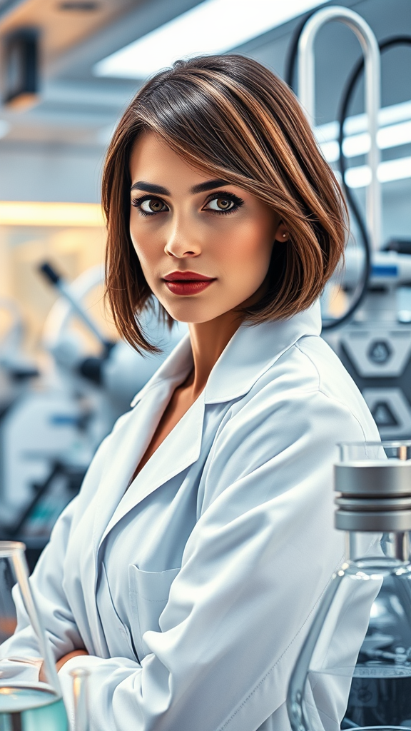 A self-assured female scientist with a stylish layered bob and luminous hazel eyes, dressed in an immaculate white lab coat, is engrossed in conducting experiments within an ultra-modern laboratory. Her half-body portrait exudes a captivating blend of calm and focus, reminiscent of the meticulous style of Henri Rousseau. She stands against a backdrop of sleek, futuristic equipment that hints at groundbreaking discoveries. The scene is rich in detail, imbued with an expressive style that captures the harmonious fusion of tradition and innovation.