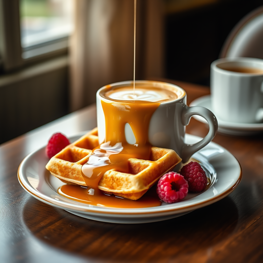 Golden Viennese waffles drenched in silky caramel sauce on a plate, accompanied by a steaming mug of latte, two raspberries adorn the dish beside the waffles, professional color grading with gentle shadows, low contrast, crisp detailed focus, gourmet food photography, beautiful bokeh, ultra-realistic imagery, striking lighting in an aspect ratio of 9:16.