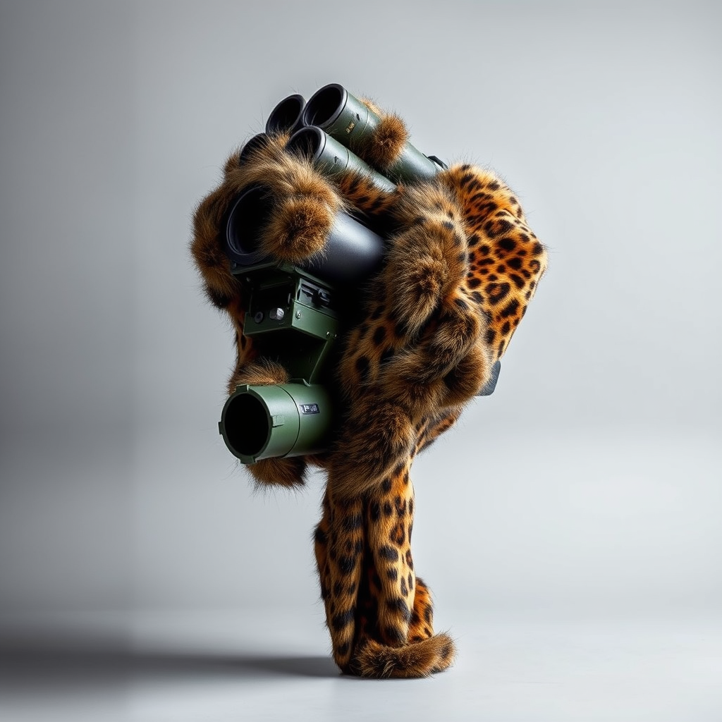 An awe-inspiring image of an antitank rocket launcher transformed into an artistic masterpiece. The BGM 71 TOW missile launcher is enveloped in luxurious leopard-print fur, provoking thoughtful contemplation on the juxtaposition of warfare and nature. Photographed in a professional studio against a neutral gray backdrop, the piece seamlessly merges strength with softness. The composition highlights this intriguing contrast between the rigid military hardware and the inviting texture of the animal skin. Professionally lit with a softbox to emphasize detail, the image employs a bokeh effect to create depth. Captured from a 45-degree angle in close-up using a 35mm lens, set at ISO 100 and aperture f4 for clarity and sharpness. This high-quality, stock-ready digital photograph embodies the essence of professional product photography while maintaining its artistic integrity.