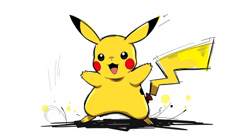 Pikachu in an energetic pose, anime style sketch, nvinkpunk influence, abstract yet bold brush strokes, pronounced heavy lines, HDR Neo-Noir aesthetic, vivid neon yellow highlights, minimalist approach.