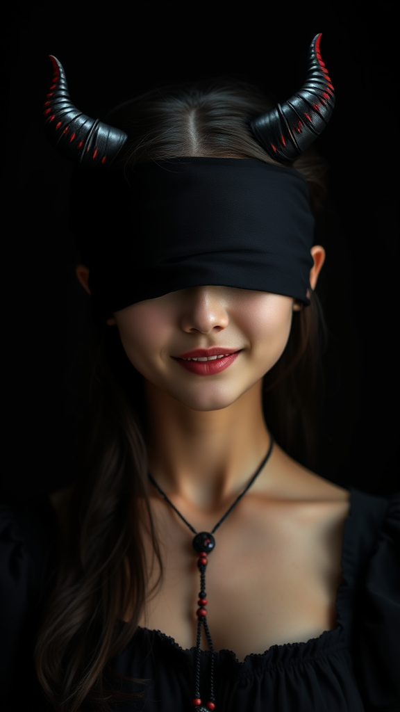Dark-themed, 1 woman, cute, demon horns, blindfold, nose, smile, closed mouth, small breasts, upper body, rosary, blouse, UHD, HDR, 8K, no duplicates or disfigurements, harmonious features, natural eyes, elegant neck, refined hands, clear details, well-composed, sharp, clean image, realistic portrayal, aesthetic appeal.