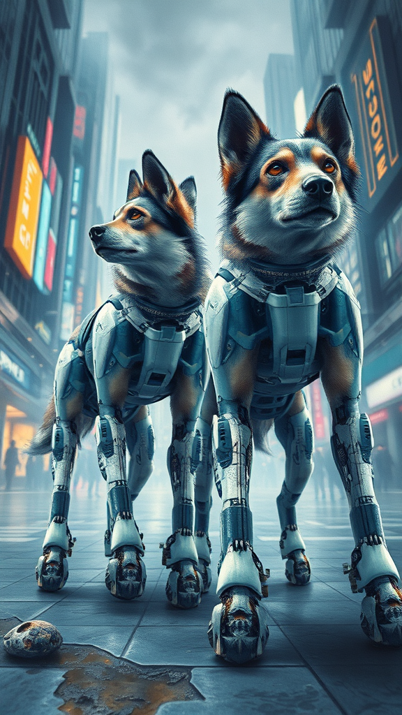 scenic view landscape cyberpunk city, intricately detailed watercolor pastel mix, ultra-realistic, futuristic robotic dogs with natural fur, seen from a low angle, two dogs with more than four animal legs, hyperdetailed full body visible, dynamic perspective, atmospheric lighting, high-tech urban background with neon accents, artistic interpretation blending realism and imagination, focus on unique features like extra appendages and captivating gaze, abstract elements interspersed, minimal digital imperfections, seamless fusion of organic and mechanical aesthetics.