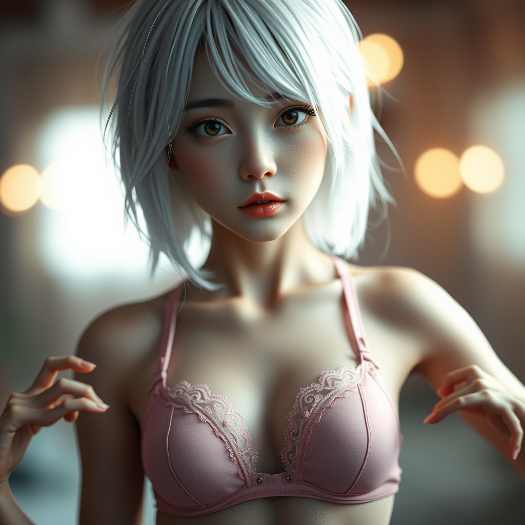 A young South Korean girl with medium length white hair, wearing pink lingerie, featuring a proportional body and a highly detailed face inspired by Greg Rutkowski and Magali Villeneuve. She has captivating eyes and a toned physique, captured in cinematic lighting with a depth of field effect. Photographic 3D render style, akin to a finely crafted doll using Octane, captures her essence. The scene subtly hints at surreal elements with unusual, distorted anatomy and blurred details, including abstract extra limbs and fingers, giving a unique, dreamlike essence to the portrait.