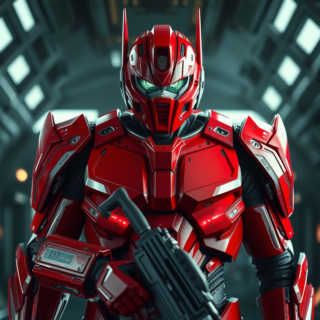 A broad-angle view features a formidable warrior clad in striking red sci-fi armor with a sleek cyber helmet. The helmet's cyber mask glows with illuminated patterns, highlighting its intricate design. This full-body insulated armor, inspired by a sleek Optimus Prime style, showcases an angry and determined expression. The warrior stands in an active pose, weapon in hand, exuding power. The head is bald, emphasizing the detailed craftsmanship of the armor. Set against the backdrop of a futuristic spaceship, this scene embodies a dark sci-fi movie style with natural light casting a photorealistic ambiance. The cinematic rendering is enhanced by ray tracing, capturing the armor's highest quality and detailing in ultra-high-definition 8K. With a third-person view, the blur and long exposure effects enhance the moody and cinematic lighting, creating an immersive and atmospheric composition.
