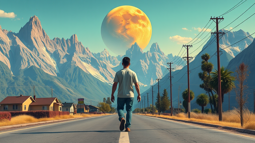 A person strolls down a street with majestic mountains in the background, inspired by the imaginative style of Beeple. The scene features a beautiful, detailed digital illustration with an orange planet and a giant moon in the sky. Utilizing super-detailed lowpoly art, the colors are bold and striking, capturing a surreal atmosphere. However, the image contains interesting imperfections such as signs of jpeg artifacts, text errors, and missing or extra digits on hands and feet, hinting at a flawed beauty. The anatomy is oddly mutated, with some parts appearing disfigured, and limbs might appear extra or misplaced. The image might be cropped or out-of-frame, giving an abstract feel. Despite these quirky elements, the artwork retains a gross yet intriguing allure, and small hints of signature or watermark may be visible.