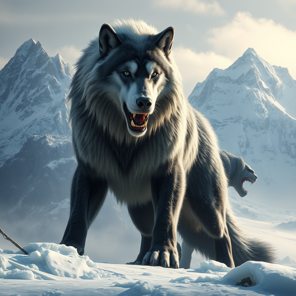 A colossal wolf-like creature stands majestically near towering mountains, surrounded by ice and snow. This behemoth embodies the raw, primal energy of a primitivist frenzy, reminiscent of a manticore, with an expressive and formidable visage akin to the works of Nicolas Mignard and Alexandr Averin. Its fur is a mesmerizing blend of dark white and dark blue hues, complementing the surreal Unreal Engine-like quality of its presence. Nearby, an enormous snow monster looms, dominating the icy landscape in a scene of epic fantasy, its features exuding an explosive wildness and crafted with the intricate detail of Terragen. The creature's coat displays a dark gray, caninecore appearance, with a powerful facial expression that captivates and commands respect.