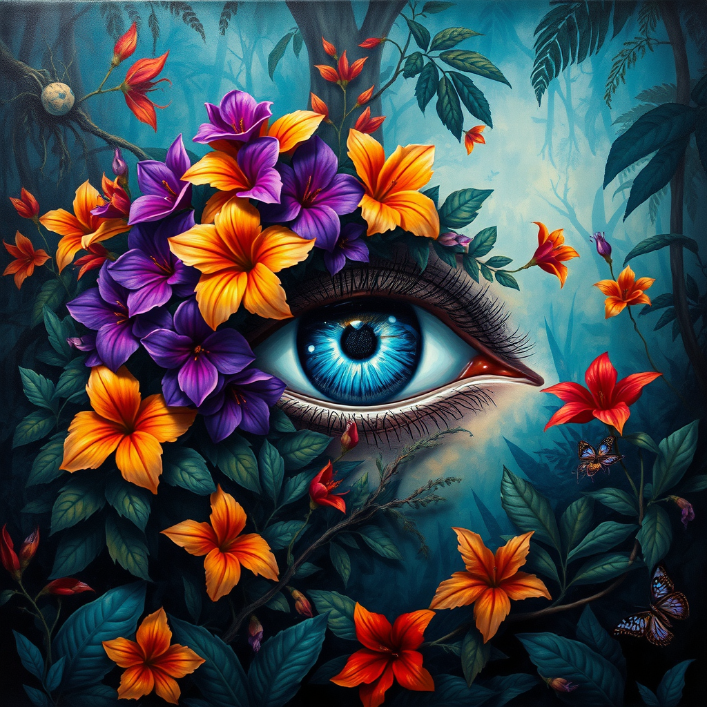 A mystical painting of an eye adorned with vibrant purple and orange flowers, set against an enigmatic jungle backdrop reminiscent of Papua New Guinea art. The surroundings merge with lush foliage, echoing James Jean's intricate style and Martin Ansin's dynamic composition. Hues of light blue and red intertwine throughout the scene, enhancing the atmospheric depth and mystery. The artwork captures the viewer’s gaze, enveloped in a surreal tapestry of abstract forms and vivid colors, rendered in stunning 32k UHD detail.