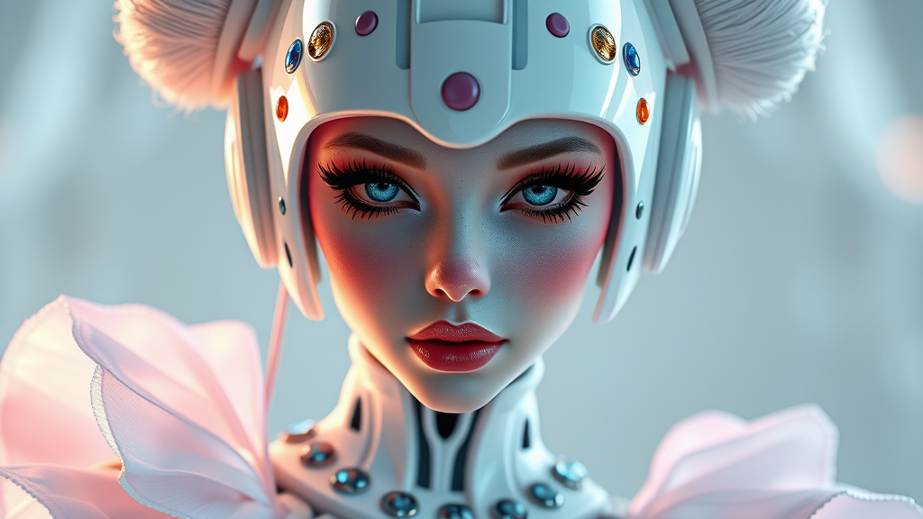 Pixar-style portrait 8k photo, stunning glossy white futuristic prima ballerina with elements of clowncore, a Russian cyborg college girl featuring golden ratio aesthetics, blending sci-fi, fantasy, and cyberpunk influences with intricate and lavish details, a highly detailed digital painting. Inspired by Ever After High, rendered in high octane, reminiscent of ArtStation concept art with a smooth and sharp focus; evokes the artistic styles of Artgerm, Loish, and WLOP with a creative interpretation, maintaining essence while introducing unique touches for an original depiction.
