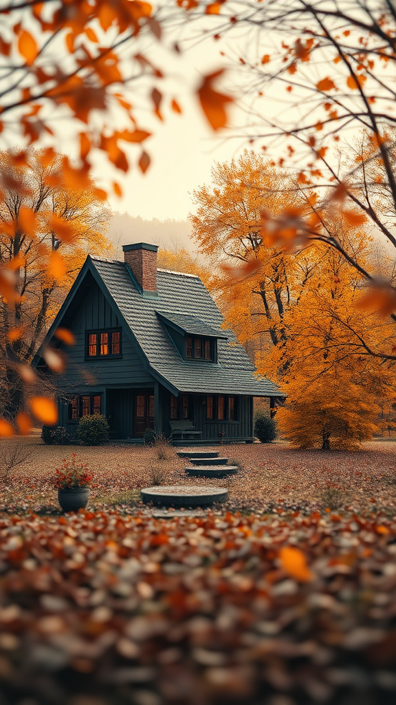 High quality, incredibly detailed 8k CG unity wallpaper featuring a photorealistic landscape; a charming house nestled among a carpet of autumn leaves in a winter's palette. Capture the essence of award-winning photography with rich texture and atmospheric depth, showcasing bokeh effects and nuanced depth of field. Employ HDR for vibrant contrast and bloom for dreamy light, with subtle chromatic aberration adding a touch of realism. The scene is exquisitely detailed, offering an immersive visual experience that remains true to the core concept.