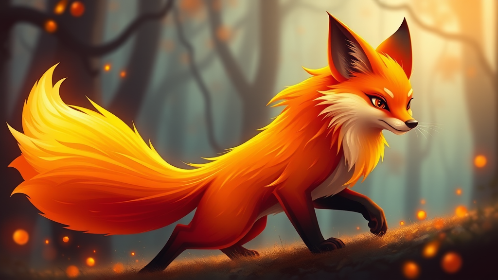 A vividly animated fox, embodying the spirit of the Firefox browser logo, with a sleek, fiery orange coat that glows with a gentle luminescence. Its fur flows like flickering flames, with bright yellow and deep red hues blending seamlessly. The fox's eyes are sharp and intelligent, sparkling with curiosity and warmth. The bushy tail curves elegantly around, reminiscent of an orbit in motion, and as it moves, subtle trails of light and ember-like particles shimmer in its wake, accentuating its swift and graceful movements through a digital forest landscape.