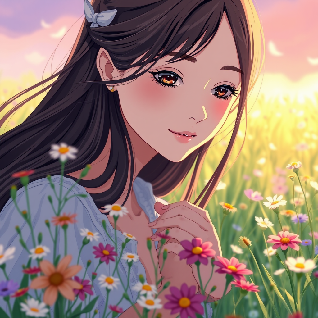 A close-up portrait of a beautiful woman gently picking colorful wildflowers in a serene meadow during a summer dawn, inspired by the style of Ken Sugimori. The scene captures the soft morning light glistening through the dew-kissed petals, highlighting her delicate features and a serene expression. Her long hair flows softly with the breeze, complementing her graceful movements. The anime art style gives a charming and whimsical feel, with simplified details and vibrant colors enriching the atmosphere of a peaceful morning in nature.