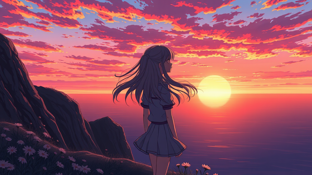 A charming anime girl gazes out at a vibrant sunset over the ocean, her hair flowing in the gentle breeze as she stands at the edge of a rocky cliff, surrounded by wildflowers. The sky is painted with hues of orange, pink, and purple, reflecting on the calm waters below.
