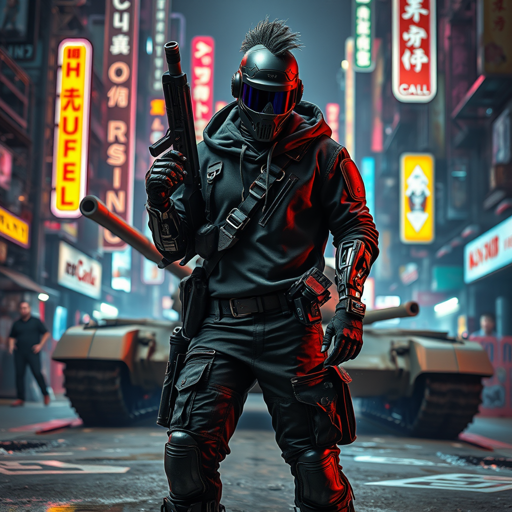 Masterpiece full-body shot of an intricate raw photography in a cyberpunk setting, featuring a highly detailed 3D rendering of a cowboy-themed, photorealistic figure. This official art piece showcases a striking mix of futuristic elements, depicted in ultra-high resolution. Set in a surreal, atmospheric, and sinister cyberpunk city with vibrant street neon lights, the scene captures a dynamic angle emphasizing a complex background with a tank in view. The central figure is an advanced cyber mecha robot adorned with armor and mechanical arms, flaunting an exo-suit absent of human presence. Dressed in worn asymmetric clothing, the character sports a tactical oversized black hoodie, paired with modern ultra-realistic black techwear cargo pants, black tactical gloves, and a Daft Punk-inspired cyber helmet complete with a HUD. A daring mohawk adds to the rebel punk-rock aesthetics, while the aggressive pose accentuates high-tech weapons in hand. Cinematic sci-fi elements shine through in this synthwave night scene, highlighted by intricate precise focus and dramatic lights and shadows. This vibrant, sharp visual is rendered with realistic Octane render techniques, capturing the essence of a stylized, advanced cyber-world. The photorealistic scene embodies the spirit of a high-tech rogue in a city pulsating with life, offering a potential Insta-worthy Photo of the Year that resonates with cinema4d and realistic visual effects at the highest quality.