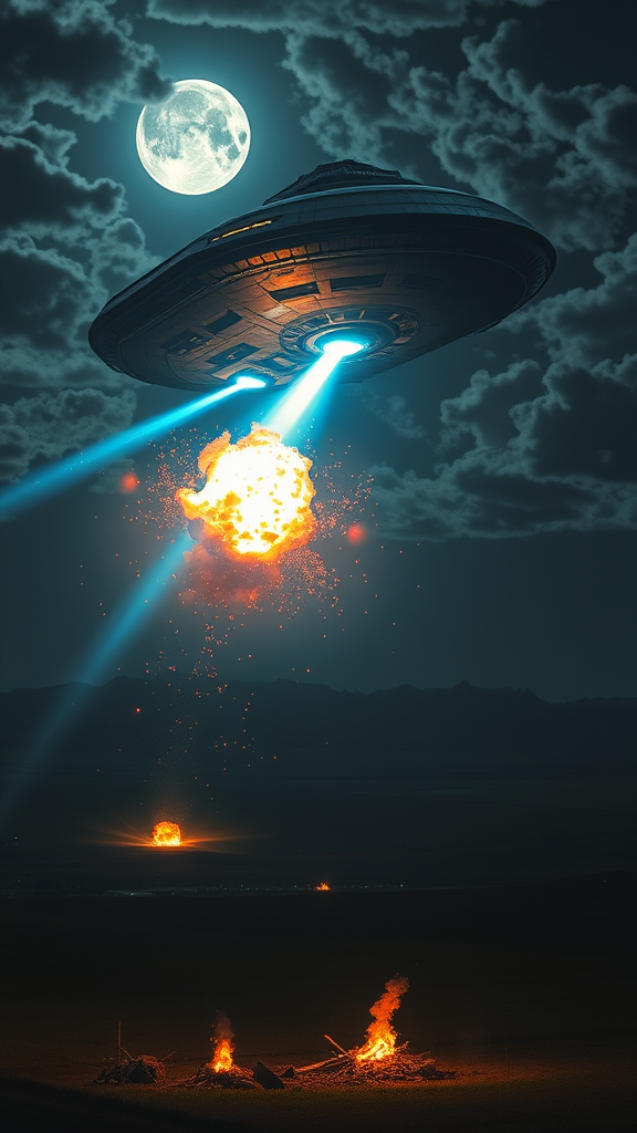 In the dead of night, a colossal spaceship looms ominously over a sprawling farm, its metallic structure bathed in the eerie glow of moonlight. Suddenly, a brilliant, concentrated blue beam erupts from its underside, cutting through the night sky and engulfing the fields below. The earth shudders as an explosion blossoms, scattering debris like fiery confetti into the swirling maelstrom of dark, churning clouds above. Flames dance across the wreckage, casting flickering shadows that stretch across the landscape. The scene is a breathtaking clash of advanced alien technology against the rustic simplicity of the earthly farm, a surreal tableau of chaos and awe, imbued with a cinematic quality that captures the raw intensity of the sci-fi spectacle.