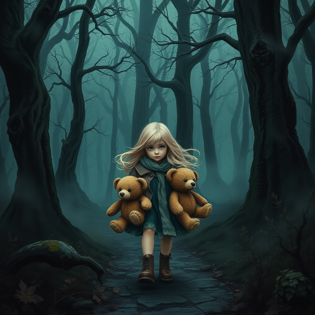 A young girl with flowing, blonde hair clutches two worn teddy bears as she steps cautiously into a foreboding forest shrouded in dark enchantments. The ancient trees whisper secrets, and shadows dance malevolently across the mist-laden ground, yet determination shines in her eyes as she ventures deeper into the mystical gloom.