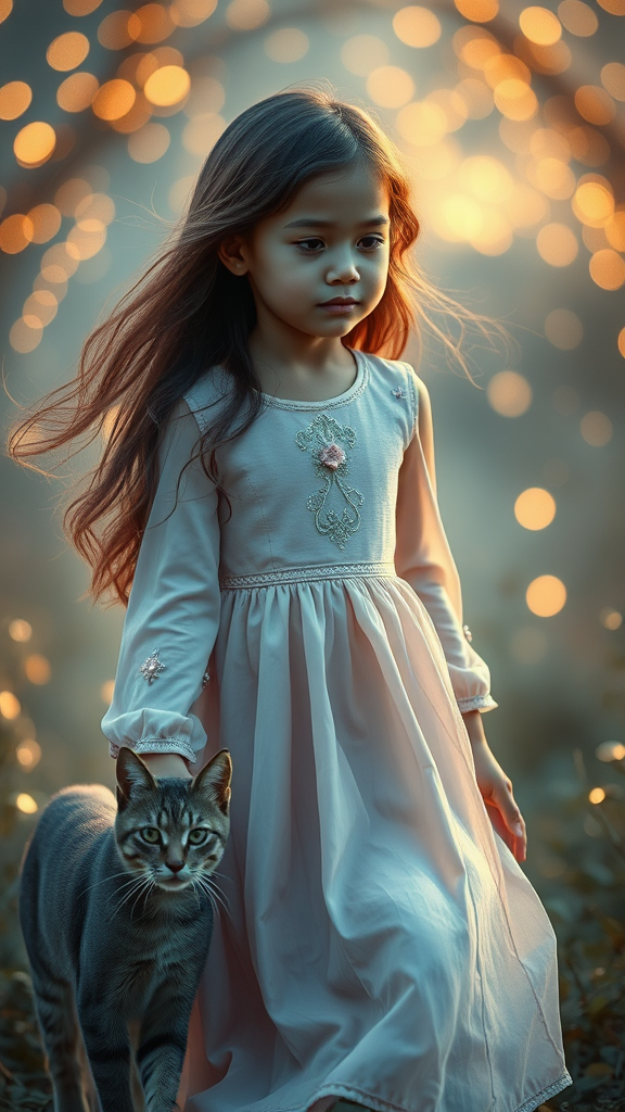A young girl with long flowing hair, dressed in a pastel pink dress, walks through a dreamy, cinematic landscape surrounded by soft glowing lights. Beside her is a sleek, graceful cat with shimmering fur. The scene is captured in stunning 4k resolution, highlighting every intricate detail, from the embroidery on the girl's dress to the delicate whiskers of the cat, adding an enchanting and whimsical aura to the moment.